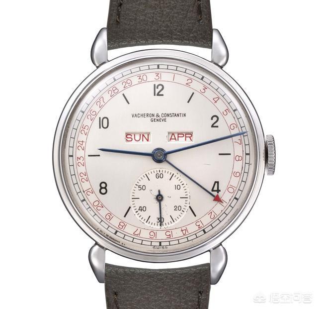 这是一枚产于1945年的35毫米不锈钢表壳,参考编号4240,全历显示腕表:表盘12点下方两个视窗是