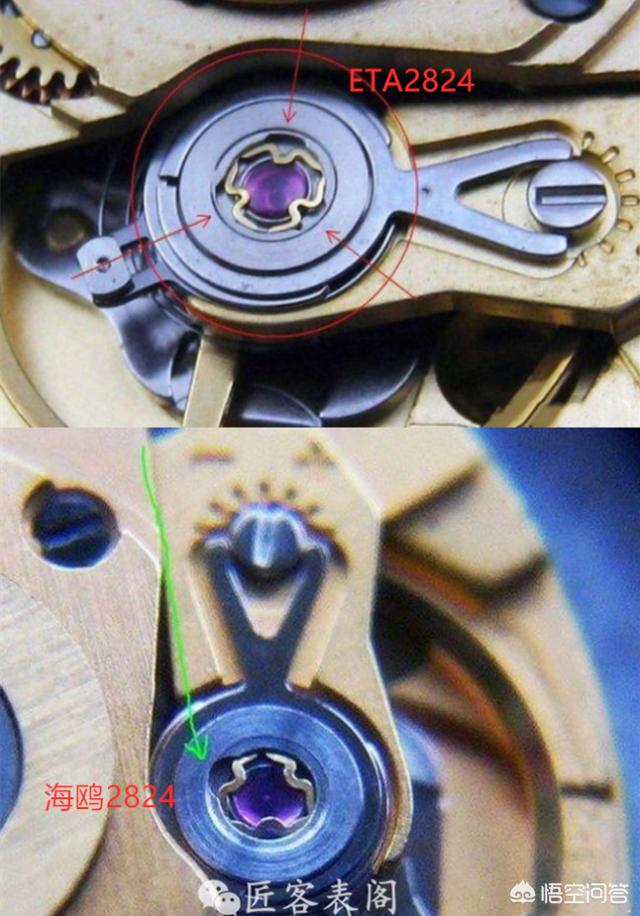 这个机芯在一款出色的复刻机芯,仿自ETA2824机芯。如果拆开后底盖,才能看到两者的差异:ETA2824机芯的三角避震器为三开口,海鸥2824机芯为单开口。但是,谁会那么无聊,拆开你的手表观察呢?两者的走时误差不大,如果调校好,海鸥的误差甚至比ETA的小。稳定是肯定不上ETA2842机芯。