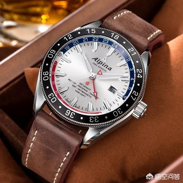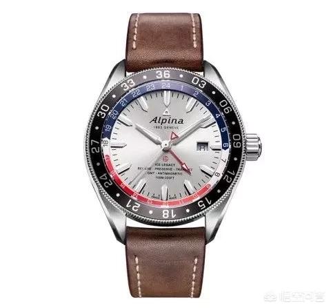 艾沛勒的设计具有强烈的户外运动风格,这款极岭系列则涵盖了运动腕表的三大需求:抗磁、抗震、防水。表盘采用银色旭日纹处理,蓝、红配色设计,粗大箭形时标和指针填充了夜光涂料。密封表底饰以三峰图案,致敬冒险精神。这款极岭配备了商旅专用的两地时功能,可通过独立调校时针设置当地时间,红色24小时指针指示第二时区时间,满足了商务和运动需求。棕色小牛皮表带以米色缝线加固处理,红色内衬亲肤舒适,尽显男士飒爽英姿