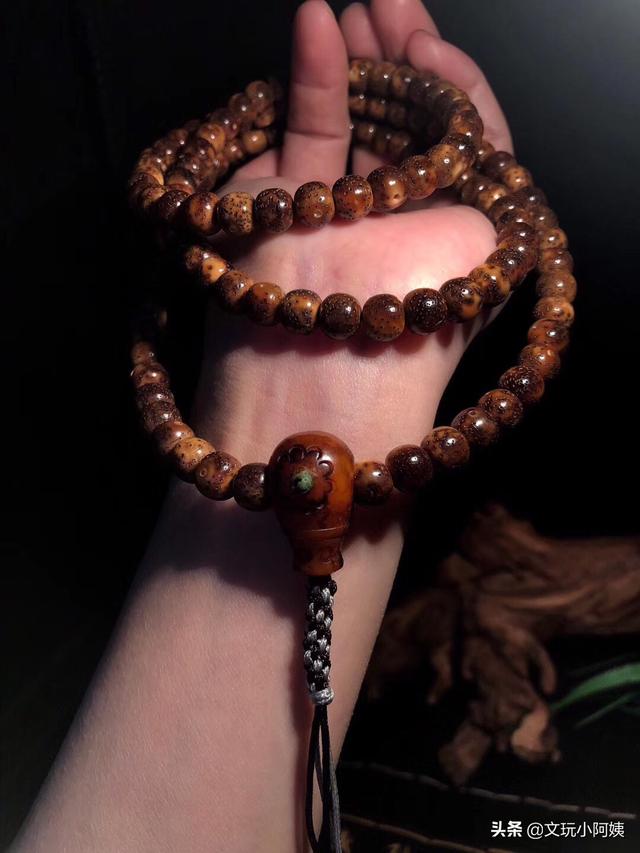 3、手套盘玩。初步抛光后,星月菩提要戴手套继续盘玩,尽可能均匀盘到每一颗,盘玩周期两个月左右。