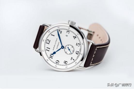 汉米尔顿卡其海军系列H78465553腕表(海军先锋),40毫米的表径适中偏小,白色表盘搭配蓝钢指针,对比鲜明。日历窗放置于3点钟方向,计时盘位于6点钟方向。小三针设计复古传统,搭配深咖色小牛皮表带,优雅简约。采用Cal.2895-2机芯,走时稳定准确。