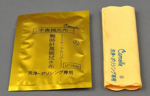 首先是抛光布。抛光布就是块“绒布”,我不是搞数理化的,所以对它的成分也不懂,就是说这个布上有什么成分,所以用完了要放回袋子里,防止效果下降。反正用完收起来就是了。手表抛光的部分有划痕,就拿布反复擦,擦一会儿,慢慢划痕就淡了,然后接着擦,一些小痕迹就没有了。这个抛光布用几下之后,它就自己变黑了,这个是正常反应,它就是用一用就变黑的。手表上一般的小划痕光用这个布,就能让划痕变浅。