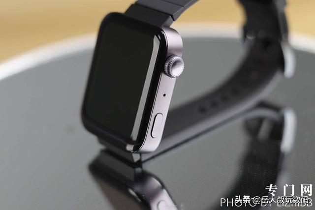 而侧面喷砂工艺的磨砂金属中框,摸起来非常光滑,左侧有一个小长条是扬声器,一个小孔是透气孔,右侧从上到下依次是表冠、麦克风和电源键。