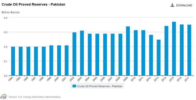 巴基斯坦已被探明的原油工业储量估计有6.68亿桶,经过不断开采,估计尚有剩余储量2.52亿桶。巴石油工业增长稳定,过去的6年中平均每天产量约5-6万桶,现今的石油年产量总计约1800万吨。但过去的6年中,巴国对石油产品的需求和消耗却在以每年平均6%的速度增长,致使石油在全巴初级能源中所占比例达到42.8%,目前全巴基斯坦对石油的需求量每年约12000万吨。由于本土资源的不断消耗,巴当地石油生产已从1996/1997年的2127万桶下降到2001/2002年的2098万桶,降幅1.3%。而进口则从1996/1997年的2859万桶增加到2001/2002年的5316万桶,上升了86%。各年份石油生产和进口情况详见下表。