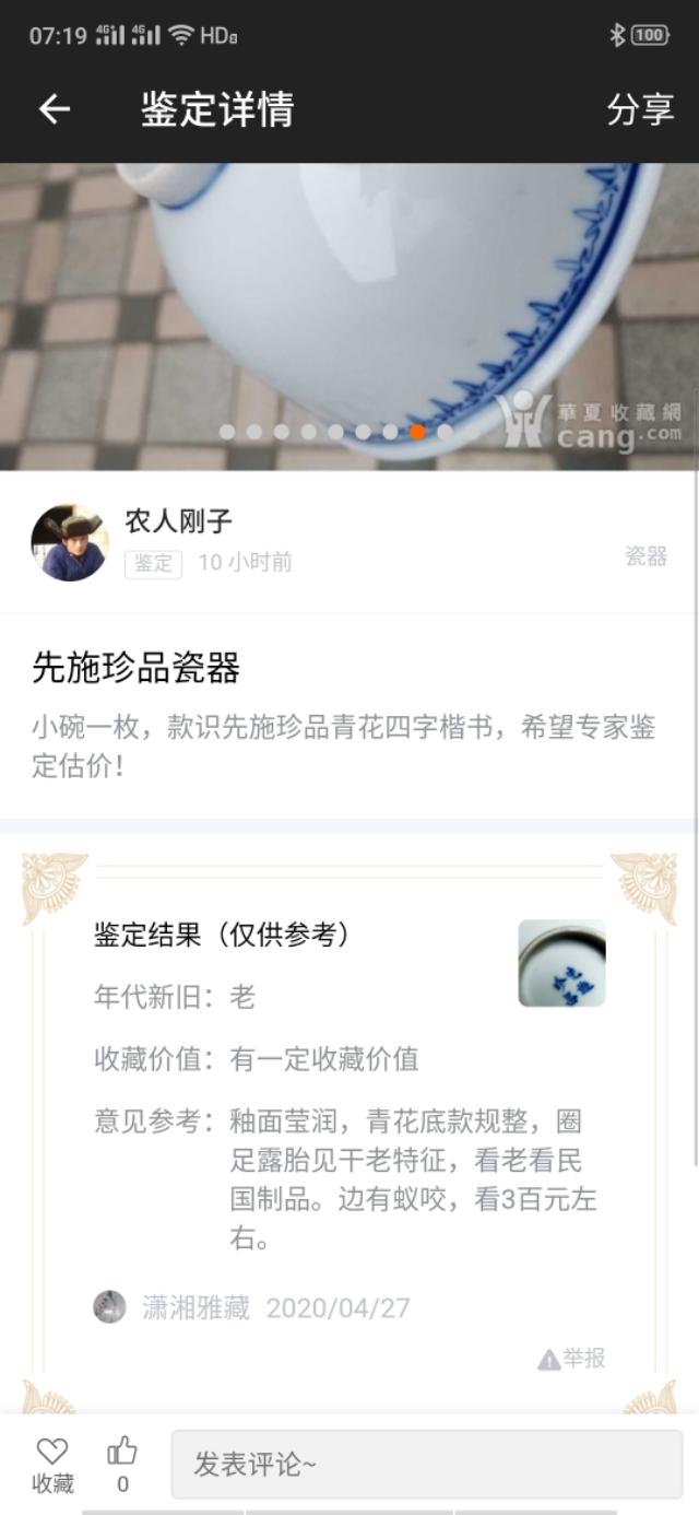 很高兴回答您的问题,古董、古玩怎样出手这个问题一直都是困扰很多藏家的问题,首先要定义古董和古玩的新老、真假,这是两个概念的,并且要定义在真、假、精、普、完整、伤残等,古董是讲是有历史和艺术信息的具有文物收藏和欣赏价值的物件,并且具有保值、升值的经济价值。收藏是一个很好的兴趣爱好,在玩的过程心里,不仅仅收获快乐,并且也可以带来经济收入! 古玩出手交易有很多途径,比如同爱好之间的交流交易、古玩店交易、古董小贩收购、摆地摊、网上销售(大的古玩交易网站)、拍卖等多种途径,但首先你收藏的东西是什么层次的也很重要,很多对鉴宝等很痴迷,认为一个老物件可以改变他一生的命运,很多都是抱着一夜暴富的发财梦,我觉得收藏定位很重要,心态也很重要,如果心中抱着发财心态来要收藏和交易,那么有可能被五花八门的社会有企图的人利用,比如假拍卖公司收取保险、图录费、保管费、鉴定费等,只要你出钱也有所谓的专家给你开具一个貌似有权威的鉴定证书,实际上就是一文不值的假证书,也不要看某书、网站、博物馆等有类似的古玩就如依葫芦画瓢的买,因为很多造假者就会根据博物馆等有的就去仿造......你可以将你的古董拍摄成照片发到权威网站(华夏收藏、7788收藏、古玩论坛等)讨论贴、鉴定板块先鉴定,如果大家都说是某个时期的价值多少等,也可以在上面直接担保交易,也根据这个在其他渠道交易! 此图为华夏鉴定贴截图 |
