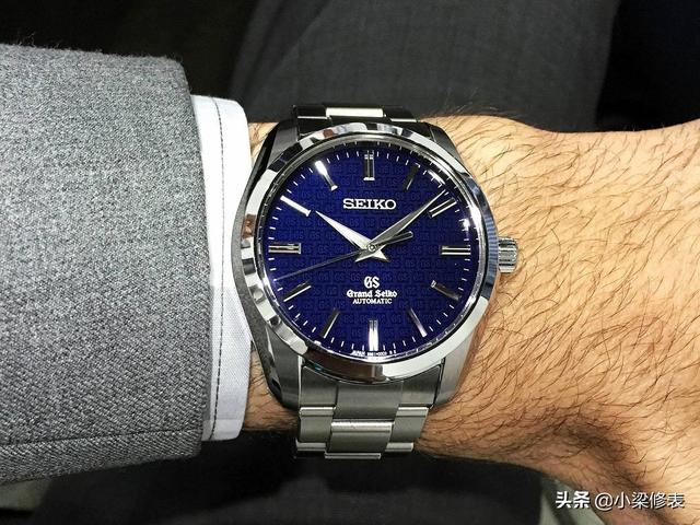 这款新的42毫米表壳有3种不同的表盘供您选择:银色(精工SBGR099),黑色(精工SBGR101),无限量版和带有特定蓝色表盘的500枚限量版,即目前的精工 SBGR097。普通版的表盘带有简单的旭日纹,而Grand Seiko SBGR097则采用重复图案,刻有'GS'徽标(适用于Grand Seiko)。当光线直接照射在手腕上时就会突然弹出(照片确实强调了几何图案)。典型的Grand Seiko dauphine指针-坦白地说,它们无疑是有史以来最好的指针,其大的抛光倒角和平坦表面上的拉丝处理。指针的执行非常出色,对于刻度来说也是如此 具有完全相同的光洁度。这表明日本人对细节的热爱。