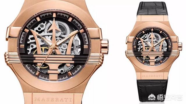 PVD玫瑰金表壳搭配金色的镂空盘面设计,表盘上镌刻着三叉玛莎拉蒂LOGO。表圈外也有Maserati字样,彰显时尚。腕表内部搭载了机械机芯,走时精准。土豪金的腕表搭配优质黑色皮带,看起来就逼格十足,戴出去能吸引不少注意。