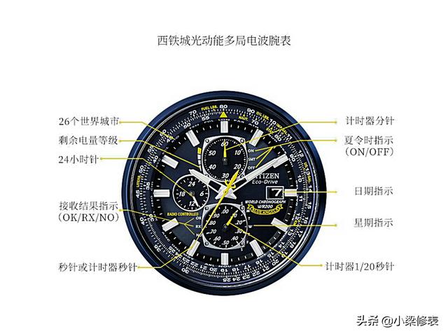 圆形腕表采用不锈钢材质,表盘采用品牌和黄色对比,在26个世界城市设有自动计时功能,并配有三个计时码表小表盘; 具有同步时间调整功能的原子计时技术可在26个时区中显示,显示为城市,万年历计时码表,1/20秒计时码表,动力储存指示器,12/24小时时间