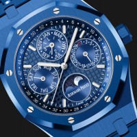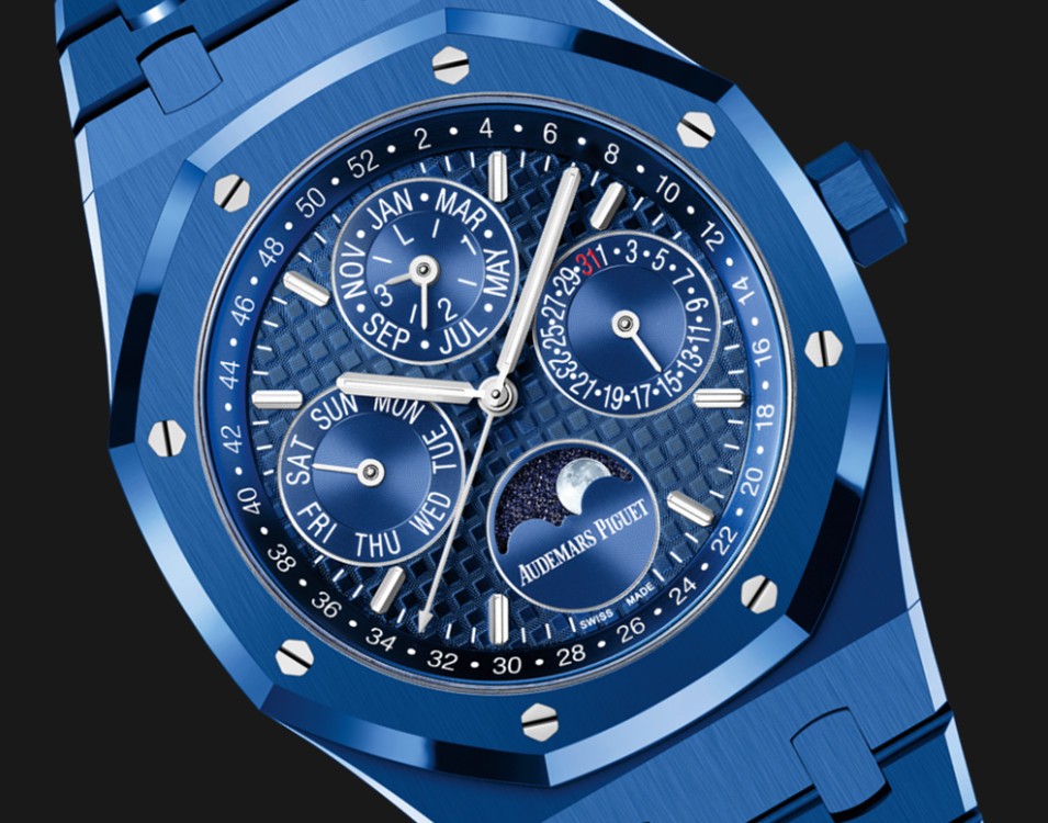 Royal Oak皇家橡树系列万年历新品腕表是爱彼首次完全以蓝色陶瓷打造表壳和表带,表带搭配钛金属AP字样折叠表扣;表壳沿用了品牌经典的八边形造型,再以八颗银白色八角形螺丝钉固定,实用又具有美赏性。