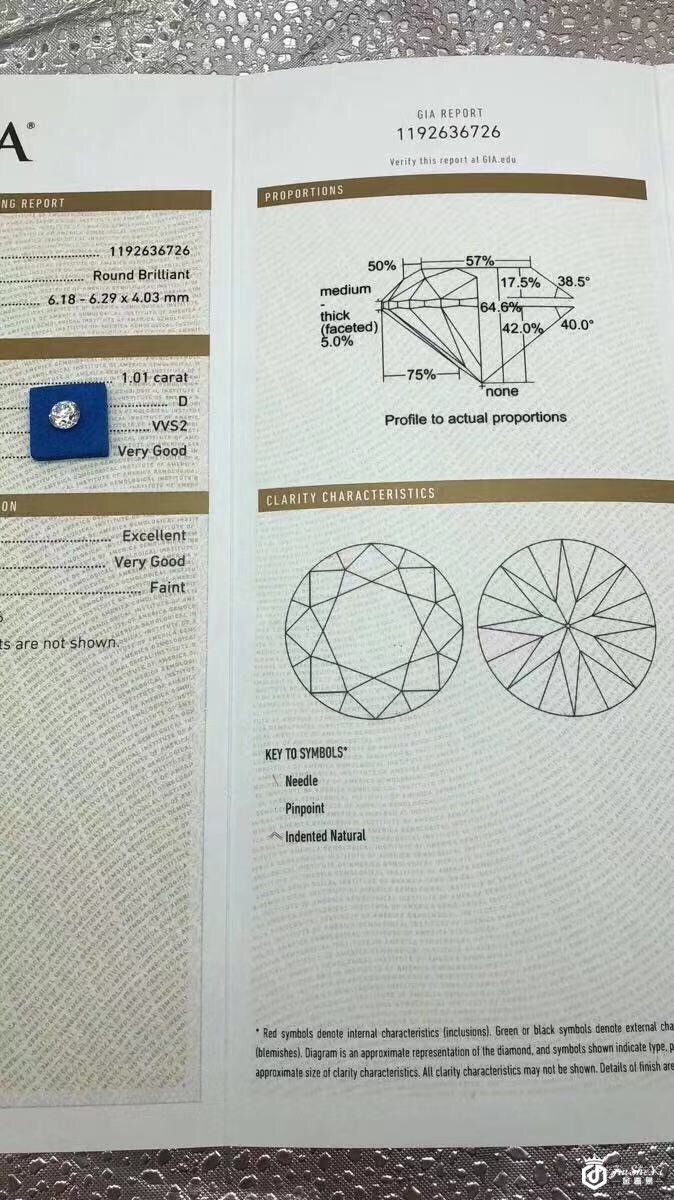 GIA 1.01克拉 D色 VVS2 VG EX VG完美切工火彩爆闪 干净通透 无奶咖绿 高折扣高性价比
