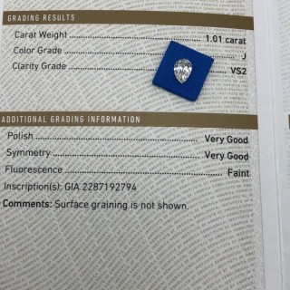 公司精选现货实拍:Gia国际证书,1.01克拉水滴白钻,J色 VS2 VG VG F,面色白,干净,实物很漂亮,性价比高