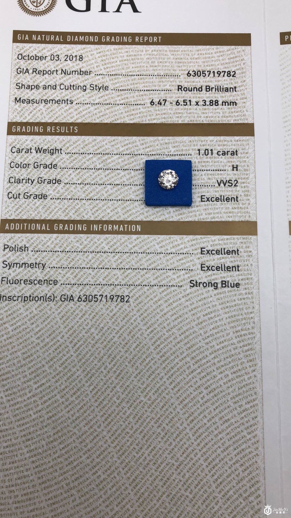 亿锦珠宝1.01克拉H色VVS2 3EX S