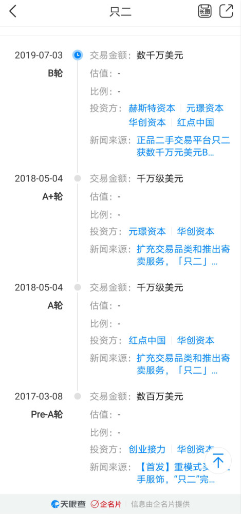 从2016年APP上线到现在,据天眼查显示只二经历了四次融资。最近一次是在2019年7月由赫斯特资本领投,红点创投等跟投的B轮融资。