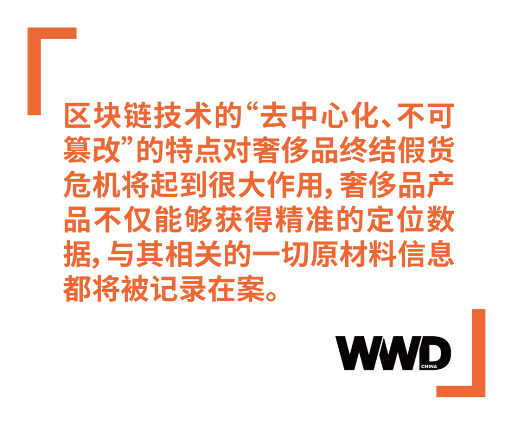 众所周知,区块链技术的“去中心化、不可篡改”的特点对奢侈品终结假货危机将起到很大作用,奢侈品产品不仅能够获得精准的定位数据,与其相关的一切原材料信息都将被记录在案,其次未来产生的每一笔交易都会被记录在案,最终通过数字记录传达给消费者。